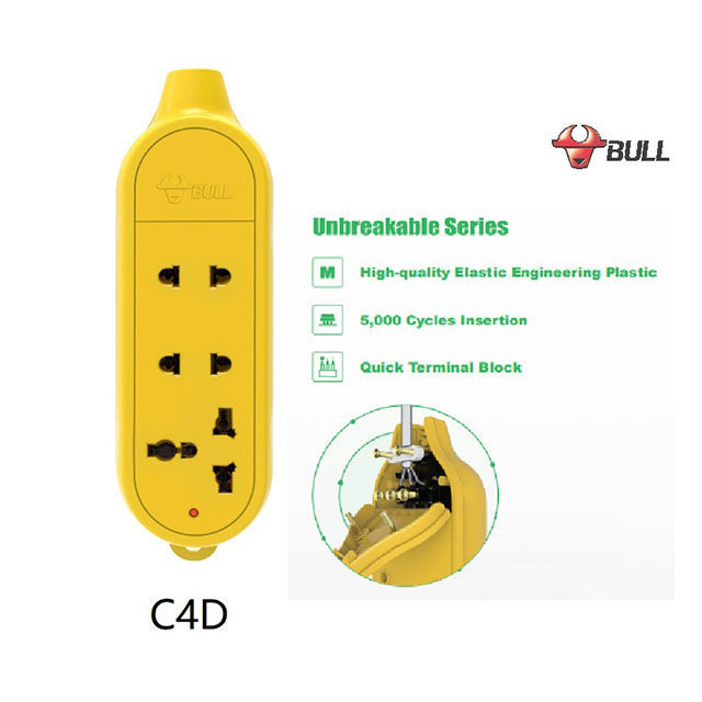 Bull Extension Board 3 Outlets Rewireable MAX power 4000W MAX current 16A Unbreakable (Yellow), C4D